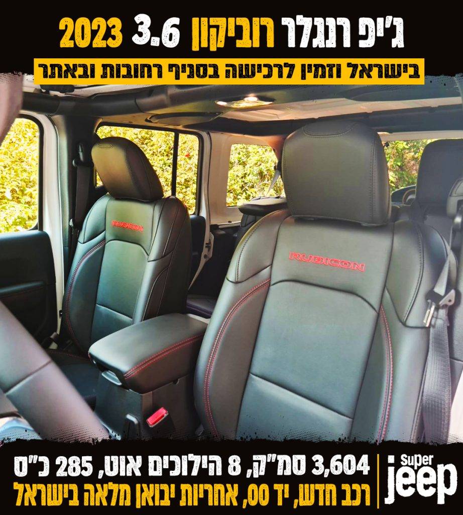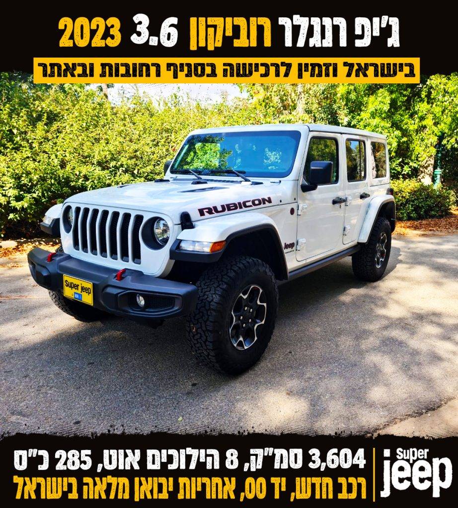 ג'יפ רוביקון, צבע לבן, שנת 2023 חדש, יד 00, 3,604 סמ"ק, 285 כ"ס, אוטומטי 8 הילוכים, 4X4, גג 3 חלקים + כנפונים בצבע הרכב, צמיגים 33, ריפודי עור שחור, פתיחת דלת בקרבה לרכב, מערכת אלפיין 8.4 אינץ + אפל פלי+ אנדרוייד ועוד! אחריות יבואן מלאה בישראל!